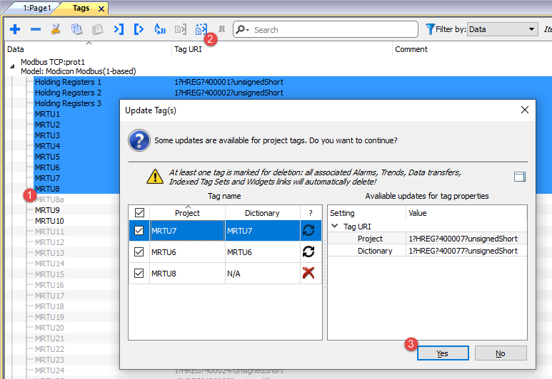 - If some change is found the update icon will be enabled, click the icon and the "Update Tag(s)" dialog with the list of found differences is showed