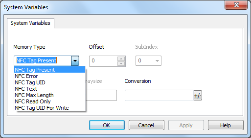 - Mettez l’étiquette CCP près du capteur. Les variables système suivantes seront remplies avec les valeurs lues à partir de l'étiquette NFC :